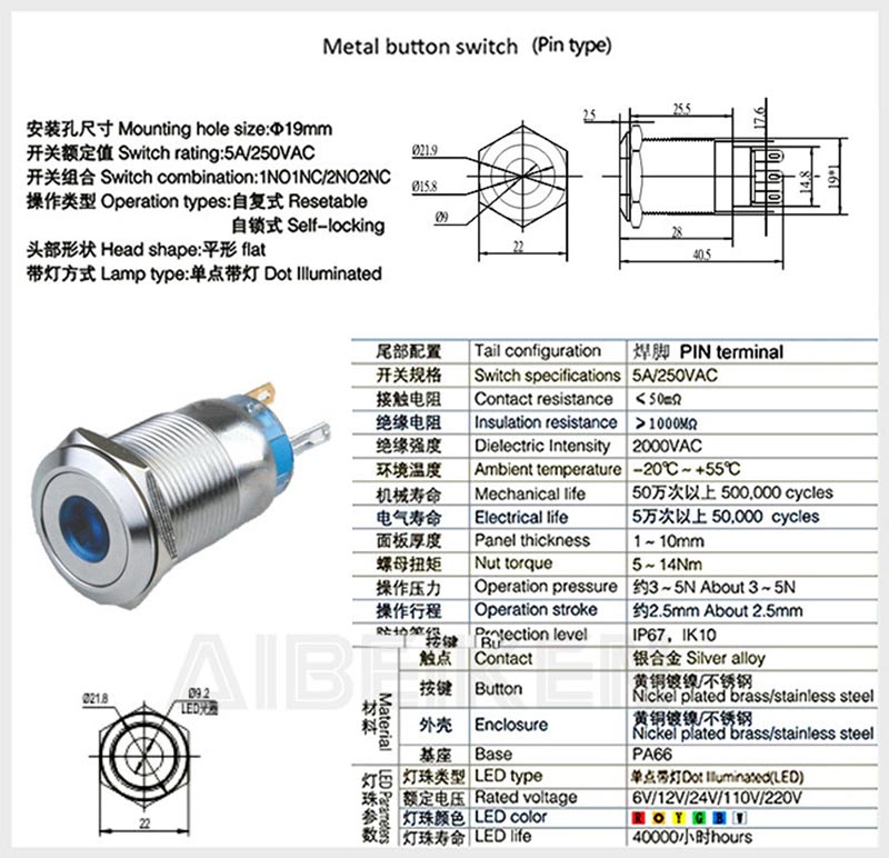 This is a perfect choice if you are in need of a rugged push button! These metal push buttons are a very tough, small, panel-mount latching switch with an illuminated blue LED. It is a SPDT with 19mm threading and 1mm pitch. This button is perfect for basic On/Off functions. These latched buttons are rated up to 5A and 250VAC while the LED is rated for 5-12V.