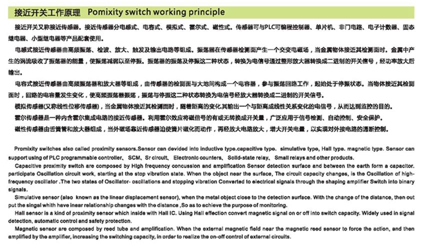 It is a component widely used in automatic control industry for detecting, controlling, and noncontact switching. When proximity switch is close to some target object, it will send out control signal. The Proximity Sensor Switch is used for testing parts such as size and speed can also be used in frequency counters, frequency pulse generator, liquid level control and processing procedures for the automatic convergence. |